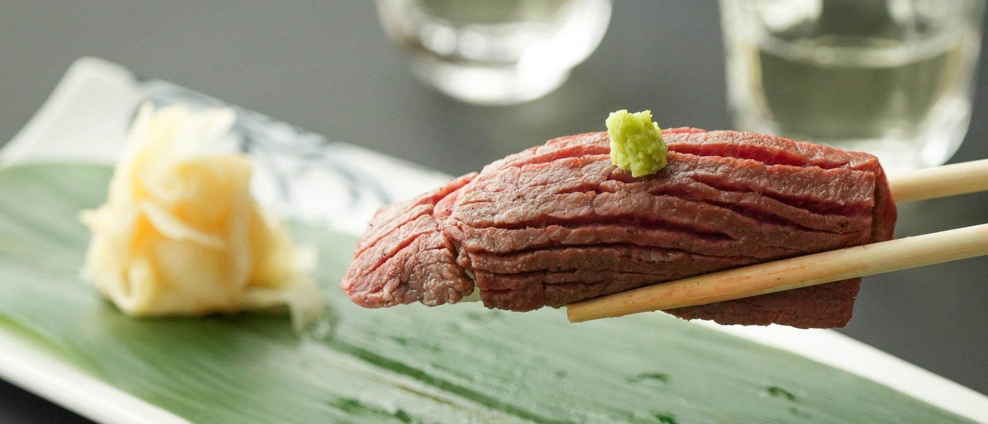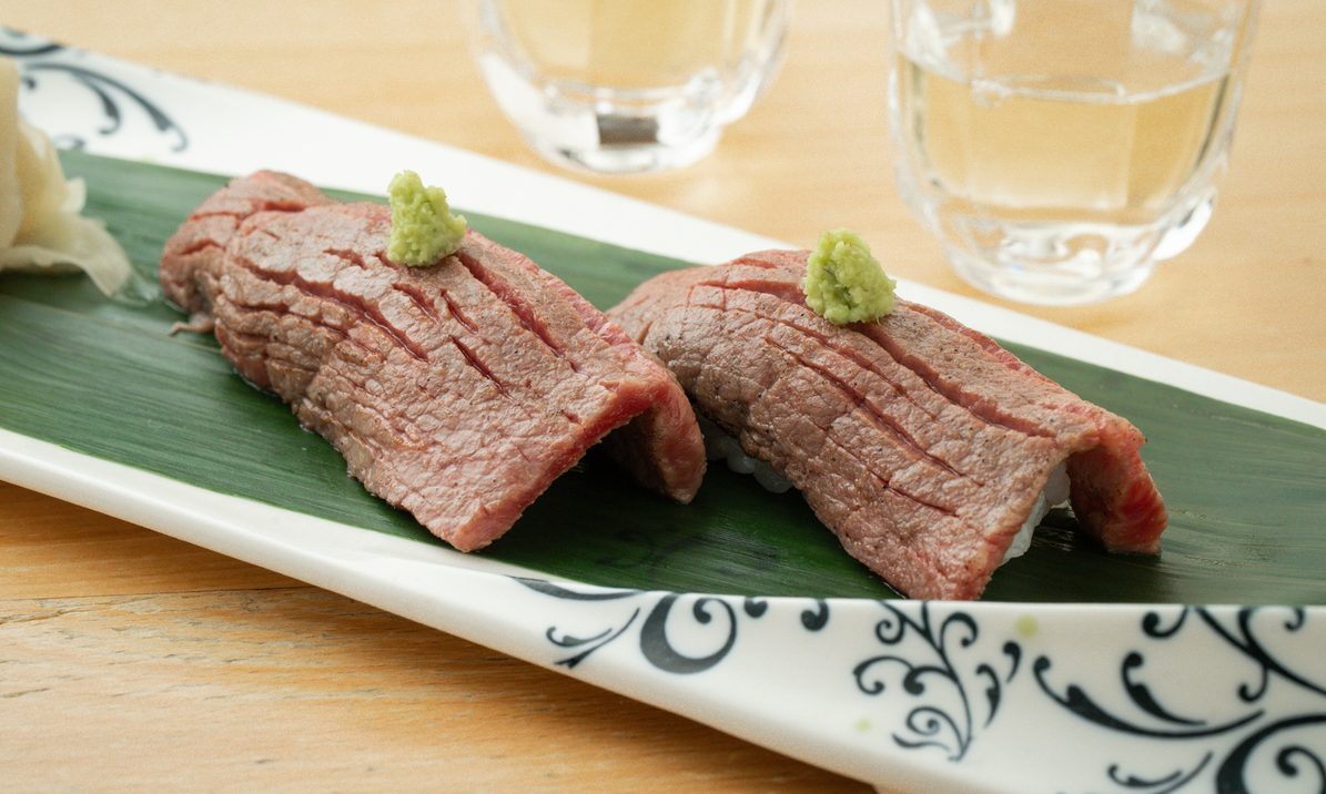 滋賀県草津市の精肉店「サカエヤ」の近江牛を使用した炙り寿司です。